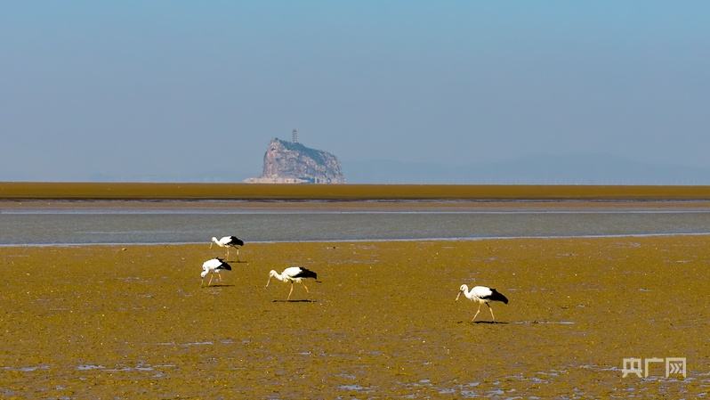 东方白鹳三五成群,或闲庭信步,或低头觅食(央广网发 李学华 摄)